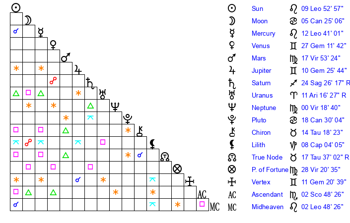 | Sun | 9 Leo 53 | 10 Leo 39 | 13 Scorpio 48 |