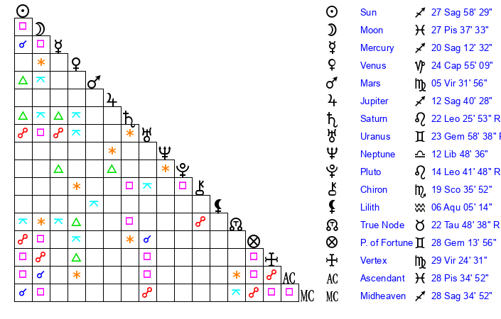 | Sun | 27 Sagittarius 58 | 29 Sagittarius 4 | 17 Pisces 3 |