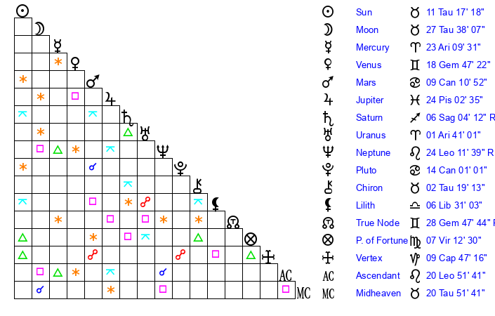 | Moon | 27 Taurus 38 | 19 Cancer 42 | 18 Sagittarius 32 |