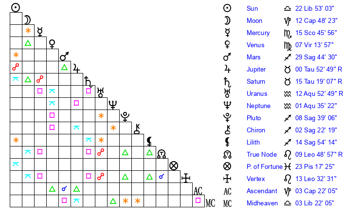 Sun | 22 Libra 53 | 23 Libra 49 | 17 Scorpio 51 |