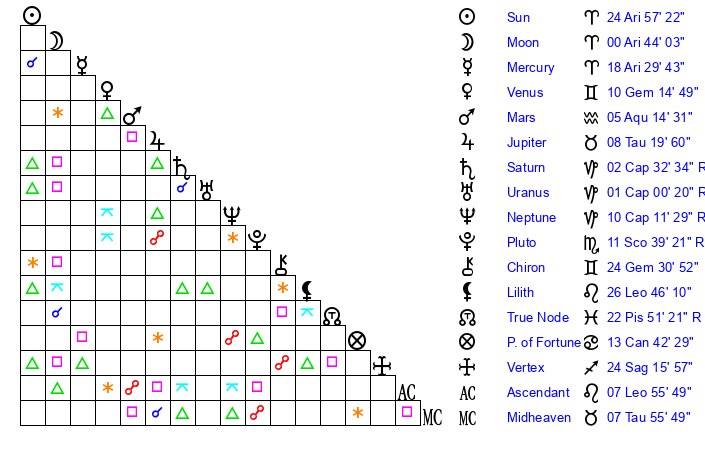 | Sun | 24 Aries 57 | 25 Aries 0 | 0 Gemini 50 |