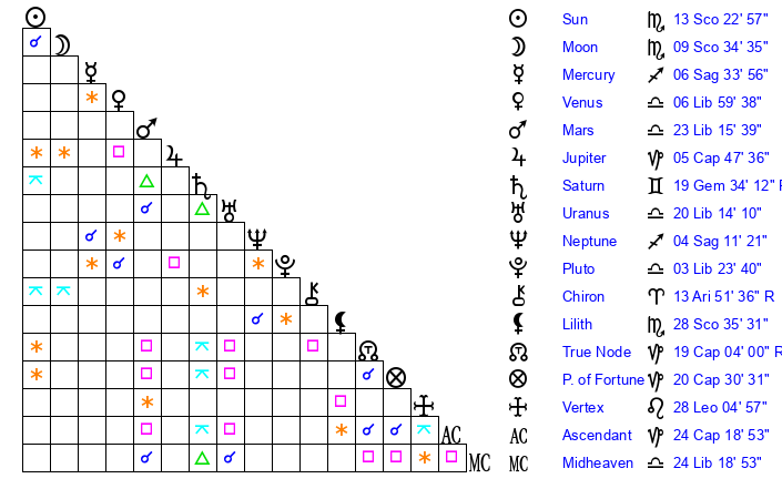 | Sun | 13 Scorpio 23 | 13 Scorpio 32 | 7 Capricorn 4 |