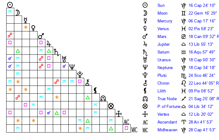 | Sun | 16 Capricorn 24 | 16 Capricorn 38 | 18 Aquarius 56 |