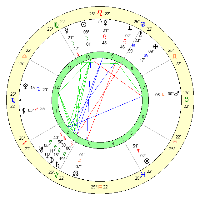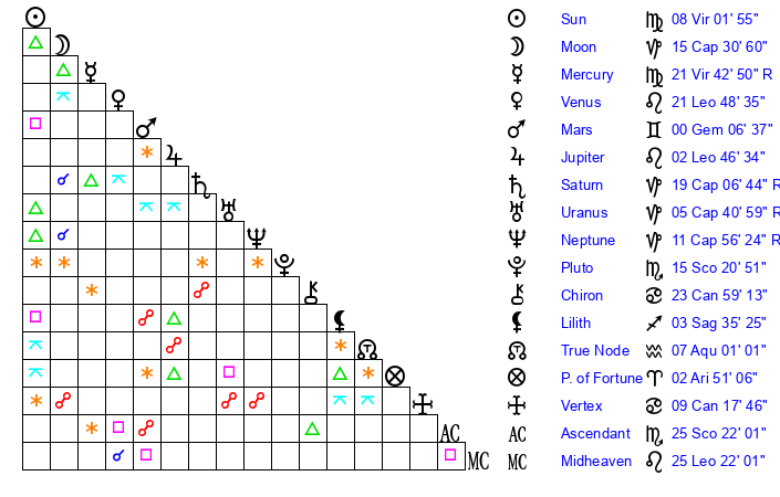 | Mercury | 21 Virgo 42 | 26 Leo 30 | 29 Virgo 57 |