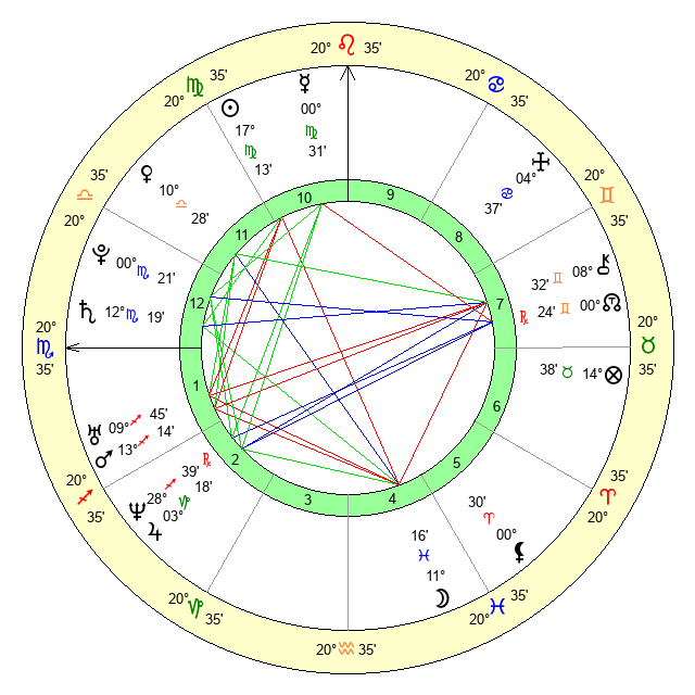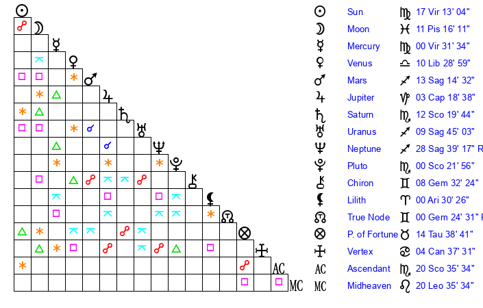 | Moon | 11 Pisces 14 | 14 Aries 0 | 4 Virgo 53 |