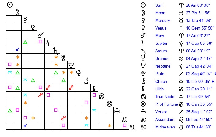 Moon | 27 Pisces 49 | 25 Scorpio 10 | 20 Aries 55 |