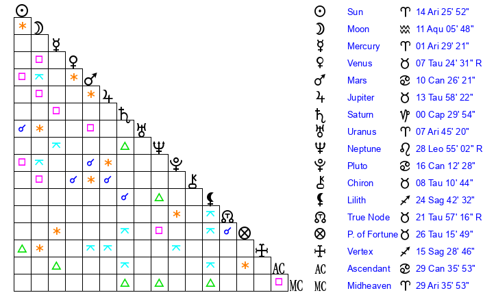 | Moon | 10 Aquarius 53 | 10 Cancer 26 | 26 Leo 56 |