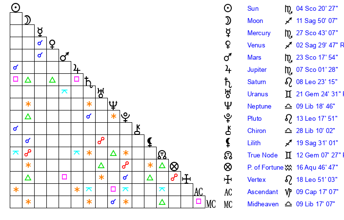 Mercury | 27 Scorpio 43 | 22 Scorpio 16 | 17 Capricorn 42 |