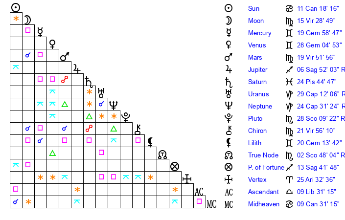 | Jupiter | 6 Sagittarius 44 | 5 Cancer 26 | 5 Sagittarius 24 |