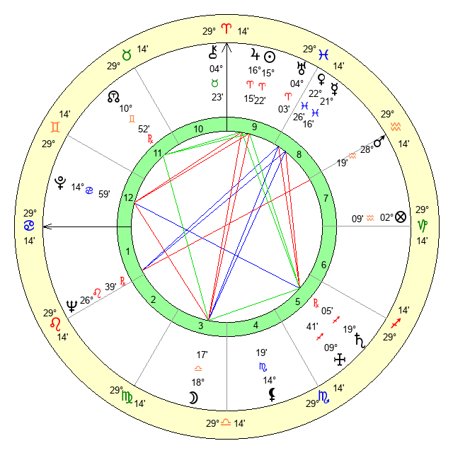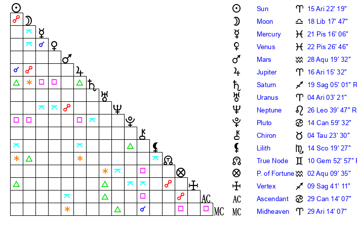 | Moon | 18 Libra 12 | 19 Cancer 56 | 0 Taurus 36 |