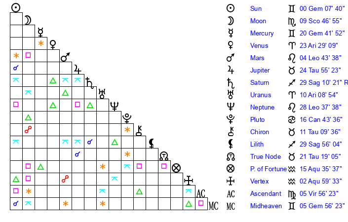 | Sun | 0 Gemini 8 | 0 Gemini 53 | 1 Virgo 59 |