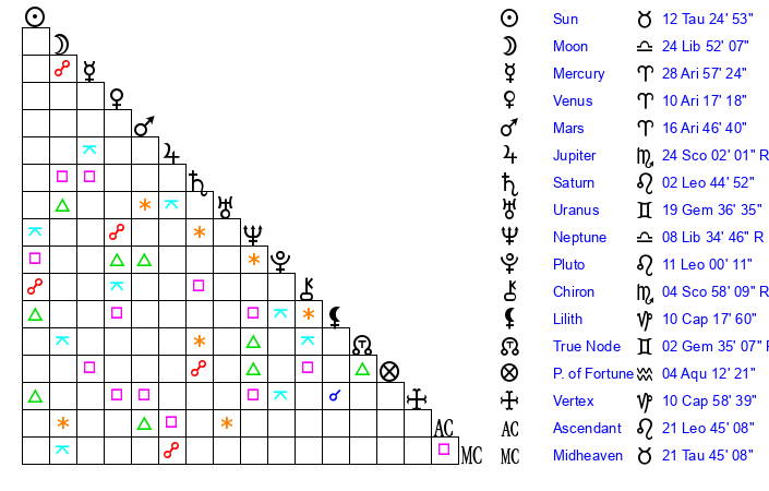 | Moon | 24 Libra 45 | 3 Leo 9 | 2 Virgo 54 |