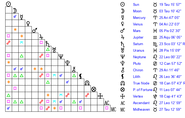 | Uranus | 28 Pisces 15 | 26 Taurus 53 | 28 Pisces 43 |