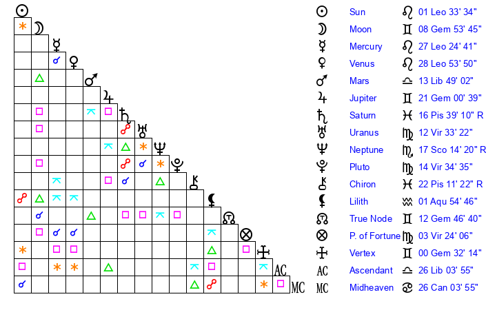 | Venus | 28 Leo 54 | 22 Gemini 34 | 10 Scorpio 24 |