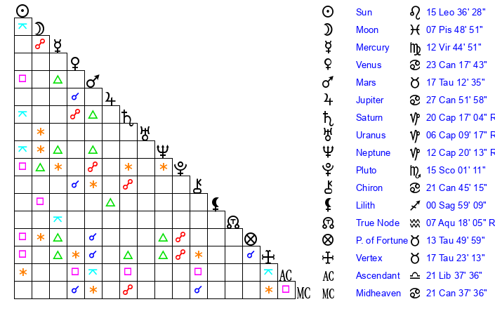 | Sun | 15 Leo 36 | 16 Leo 7 | 19 Virgo 23 |