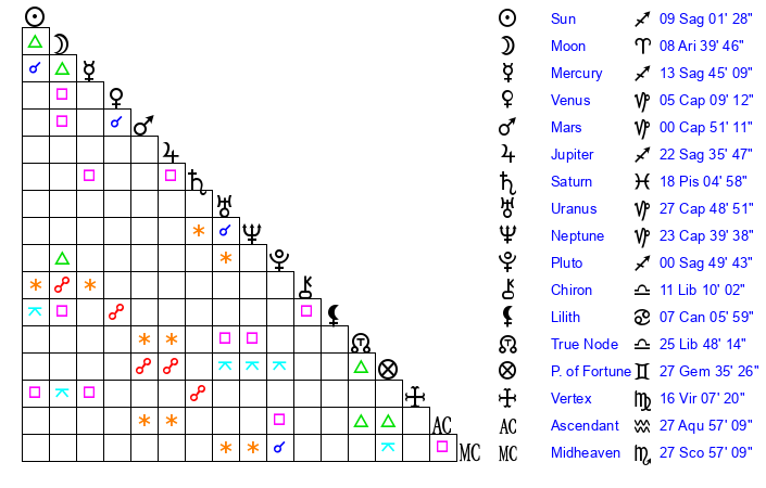 | Moon | 8 Aries 39 | 15 Sagittarius 10 | 0 Taurus 51 |