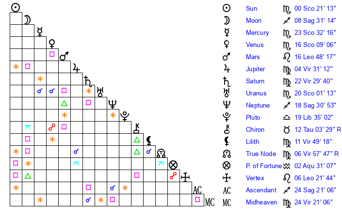 | Sun | 0 Scorpio 21 | 1 Scorpio 12 | 16 Sagittarius 41 |