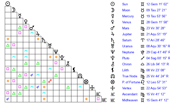| Jupiter | 21 Aquarius 53 | 28 Gemini 23 | 21 Aquarius 18 |