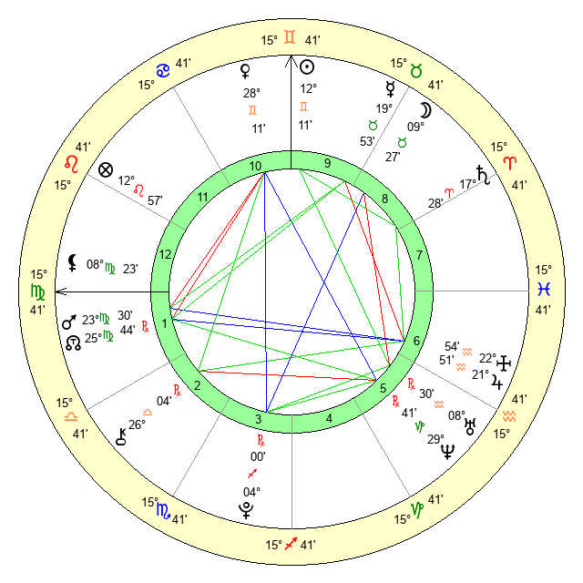 | Moon | 9 Taurus 23 | 7 Virgo 26 | 19 Taurus 30 |