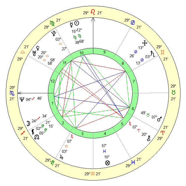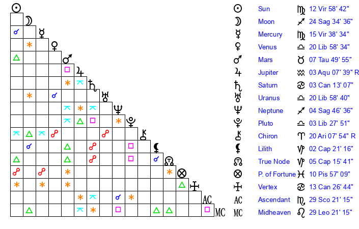 | Mercury | 15 Virgo 39 | 6 Virgo 5 | 26 Scorpio 7 |