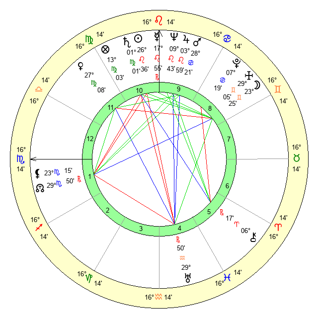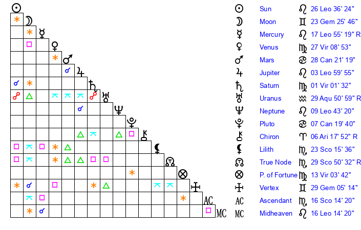 | Mercury | 17 Leo 55 | 9 Leo 26 | 7 Sagittarius 22 |
