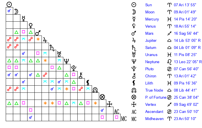 | Venus | 18 Aries 56 | 29 Pisces 14 | 23 Leo 40 |
