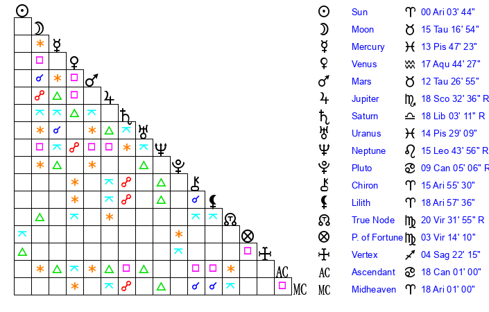 | Moon | 15 Taurus 13 | 22 Sagittarius 20 | 19 Aquarius 1 |