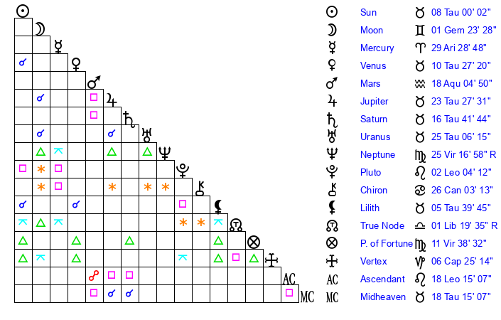 | Saturn | 16 Taurus 53 | 27 Pisces 31 | 26 Taurus 33 |
