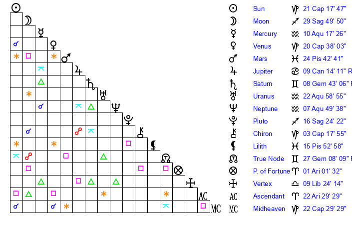 Venus | 20 Capricorn 39 | 8 Pisces 53 | 19 Aquarius 33 |