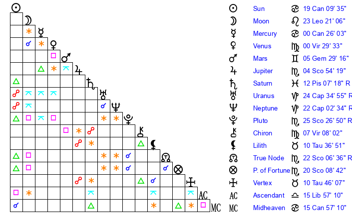Sun | 19 Cancer 9 | 19 Cancer 38 | 18 Leo 47 |