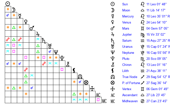 | Saturn | 15 Aquarius 24 | 1 Aries 27 | 13 Aquarius 5 |