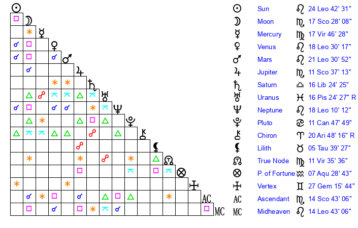 | Sun | 24 Leo 42 | 26 Leo 0 | 5 Sagittarius 27 |