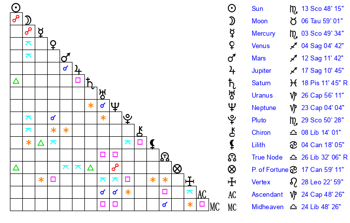 | Moon | 6 Taurus 52 | 13 Capricorn 41 | 28 Taurus 6 |