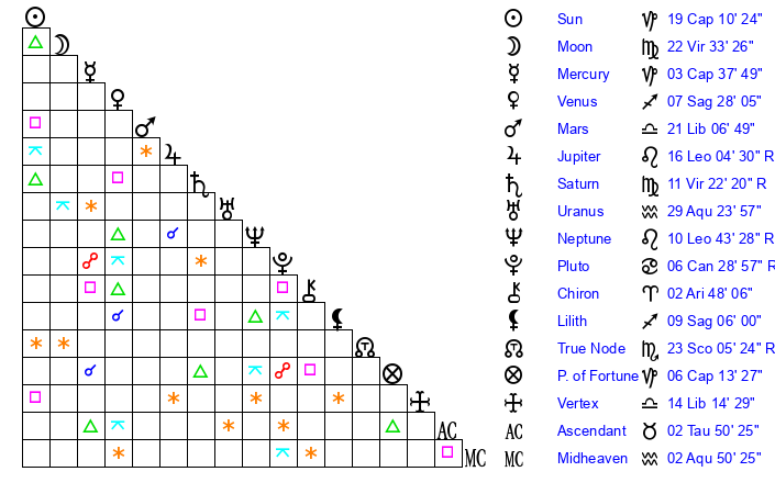 | Saturn | 12 Virgo 7 | 26 Pisces 43 | 5 Virgo 40 |