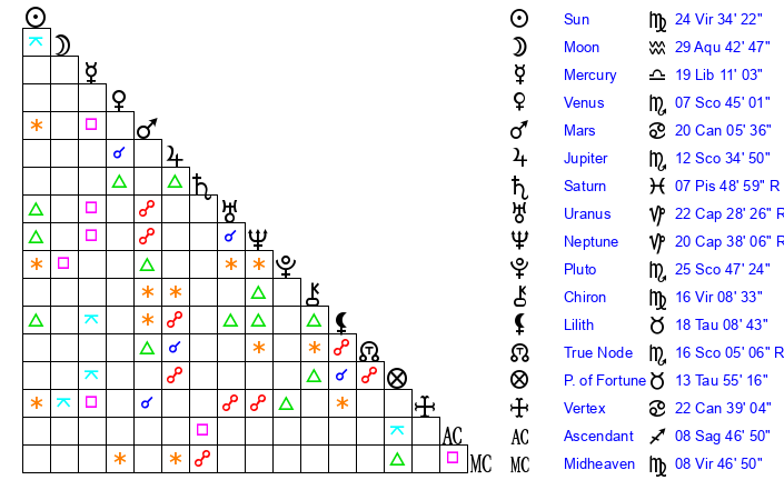 Moon | 29 Aquarius 36 | 6 Leo 20 | 16 Aries 9 |