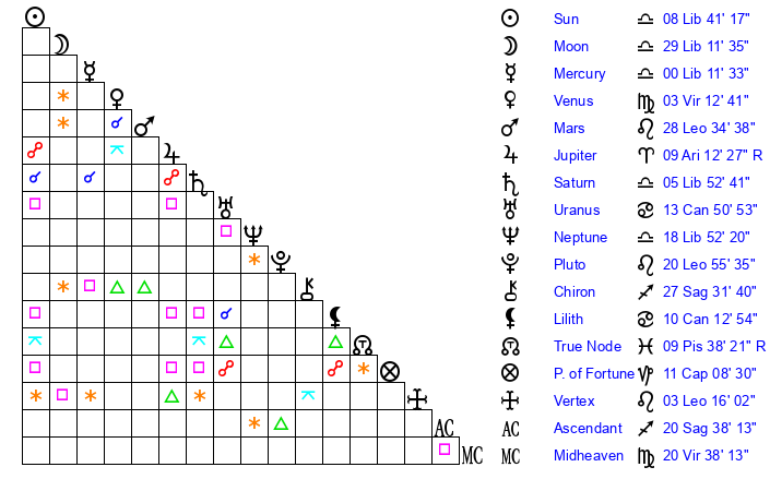 | Venus | 3 Virgo 12 | 16 Virgo 10 | 8 Scorpio 47 |
