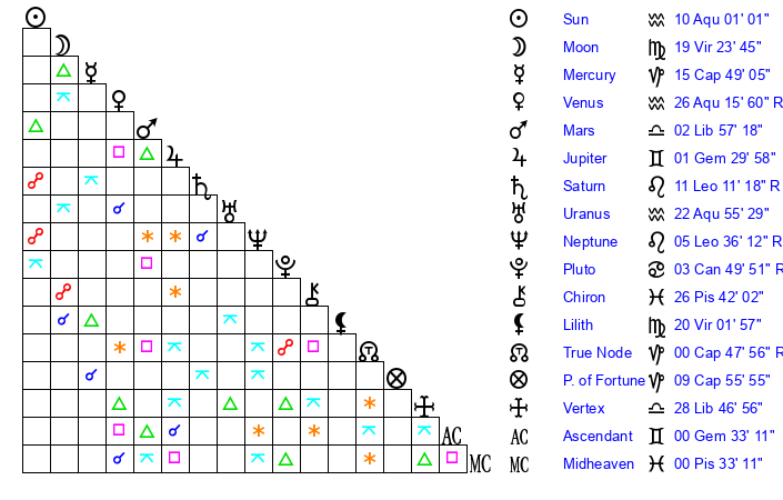 | Moon | 19 Virgo 21 | 26 Aquarius 25 | 24 Leo 30 |