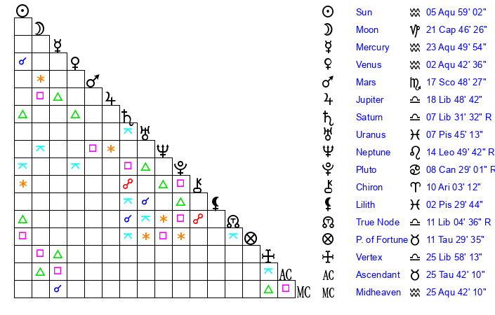 | Sun | 5 Aquarius 59 | 7 Aquarius 0 | 18 Taurus 16 |