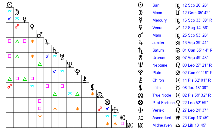 | Jupiter | 13 Aquarius 23 | 25 Cancer 6 | 4 Pisces 44 |
