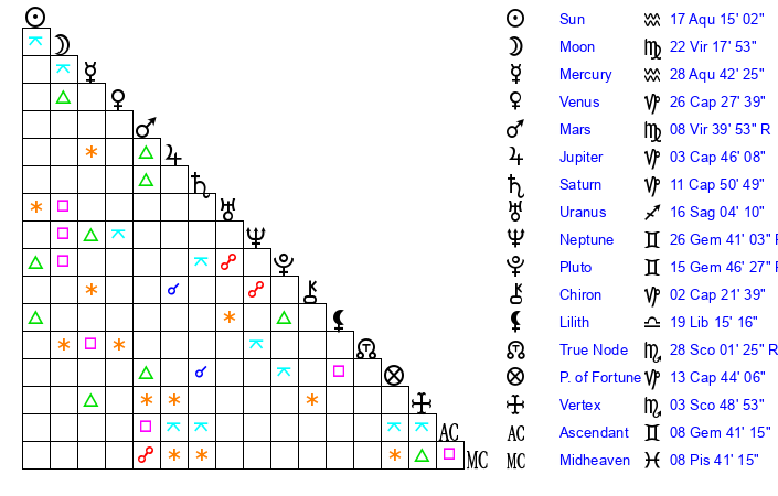| Mercury | 28 Aquarius 42 | 16 Aquarius 5 | 12 Cancer 51 |