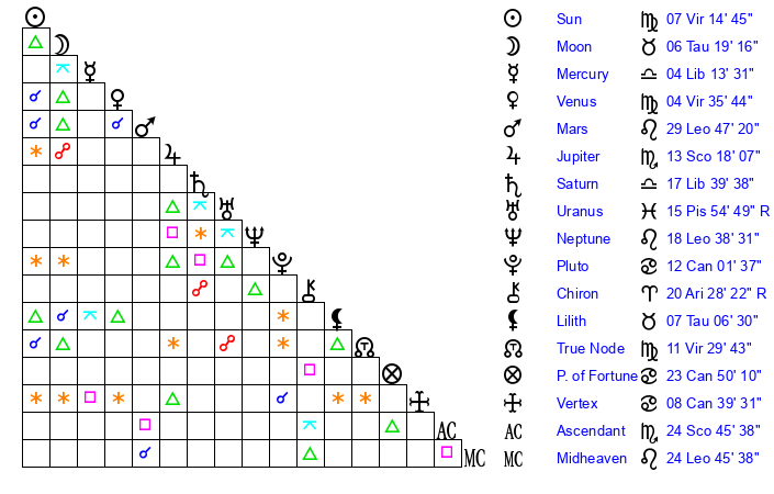 | Neptune | 18 Leo 38 | 1 Aries 21 | 20 Leo 17 |