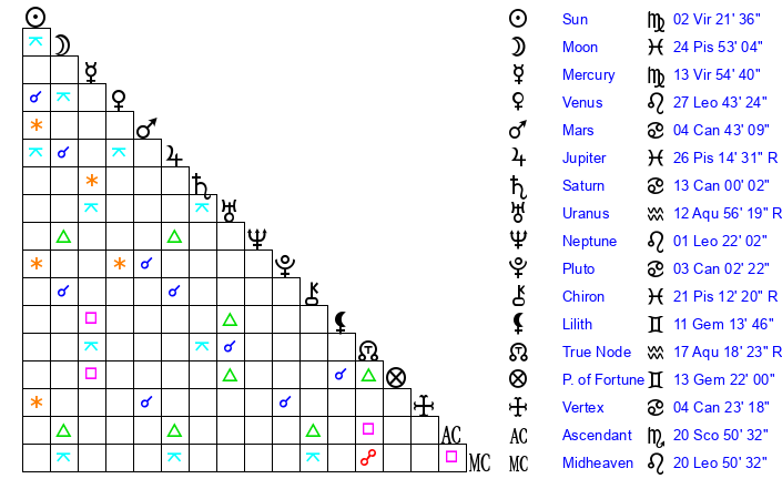 | Mercury | 13 Virgo 55 | 17 Leo 42 | 20 Sagittarius 54 |