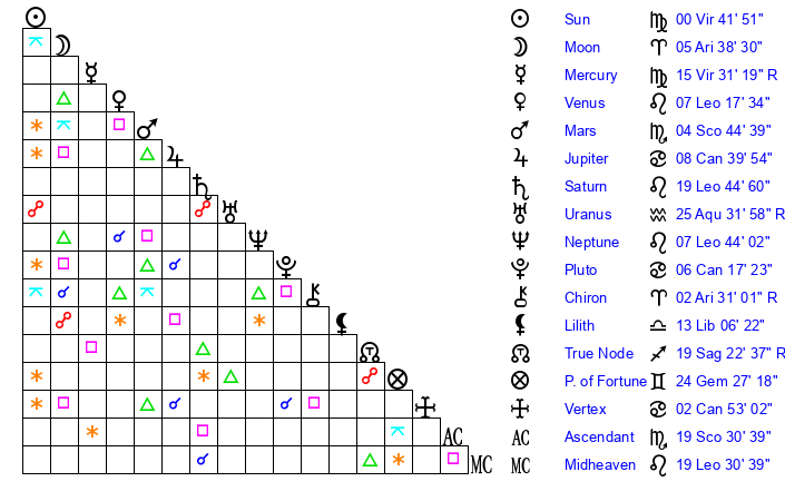 | Neptune | 7 Leo 44 | 1 Aries 31 | 9 Leo 7 |