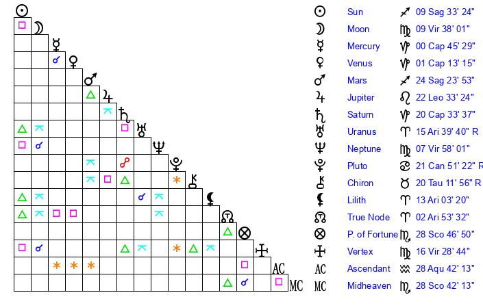 | Moon | 9 Virgo 36 | 8 Taurus 43 | 26 Aquarius 38 |