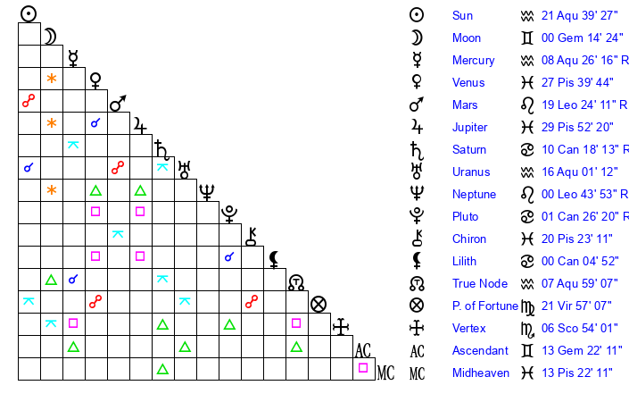 | Sun | 21 Aquarius 39 | 23 Aquarius 13 | 8 Gemini 54 |