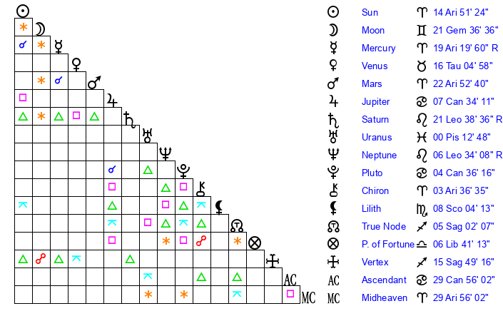 | Sun | 14 Aries 51 | 16 Aries 9 | 26 Cancer 54 |