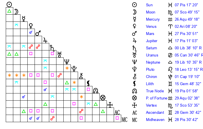 | Neptune | 19 Libra 10 | 28 Pisces 48 | 17 Libra 19 |