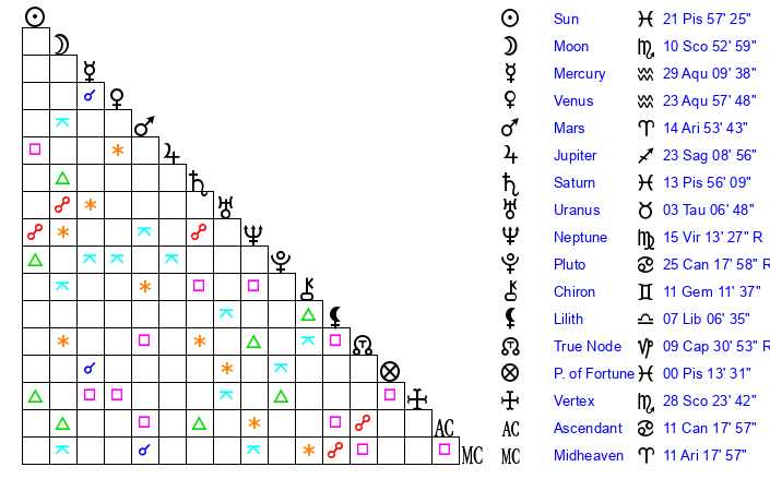 | Moon | 10 Scorpio 50 | 4 Virgo 33 | 12 Aquarius 41 |