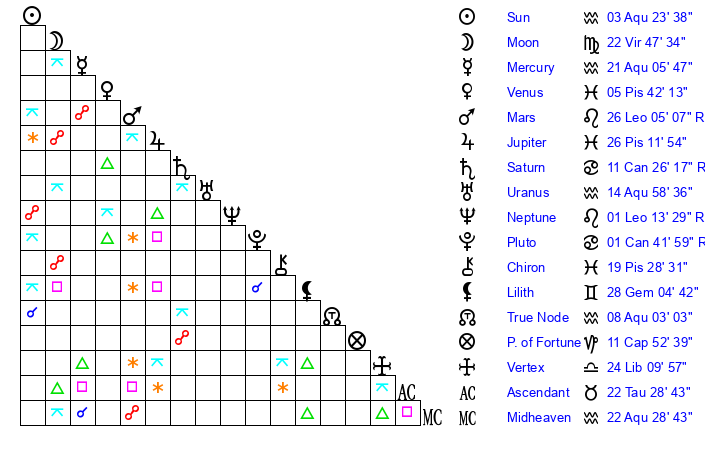 | Moon | 22 Virgo 47 | 6 Sagittarius 16 | 18 Virgo 18 |
