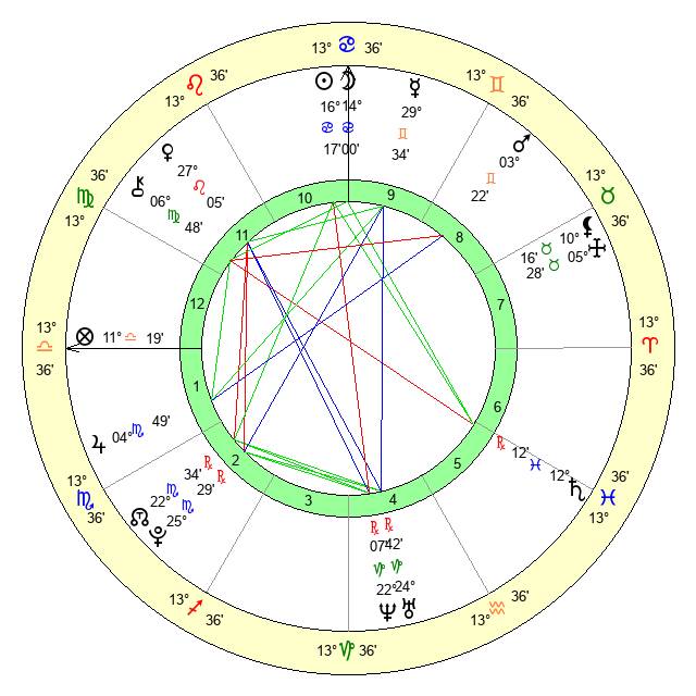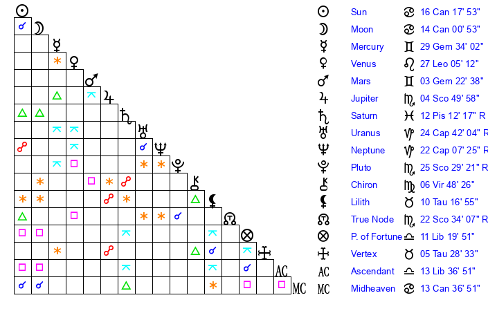Moon | 14 Cancer 7 | 21 Sagittarius 46 | 3 Virgo 4 |